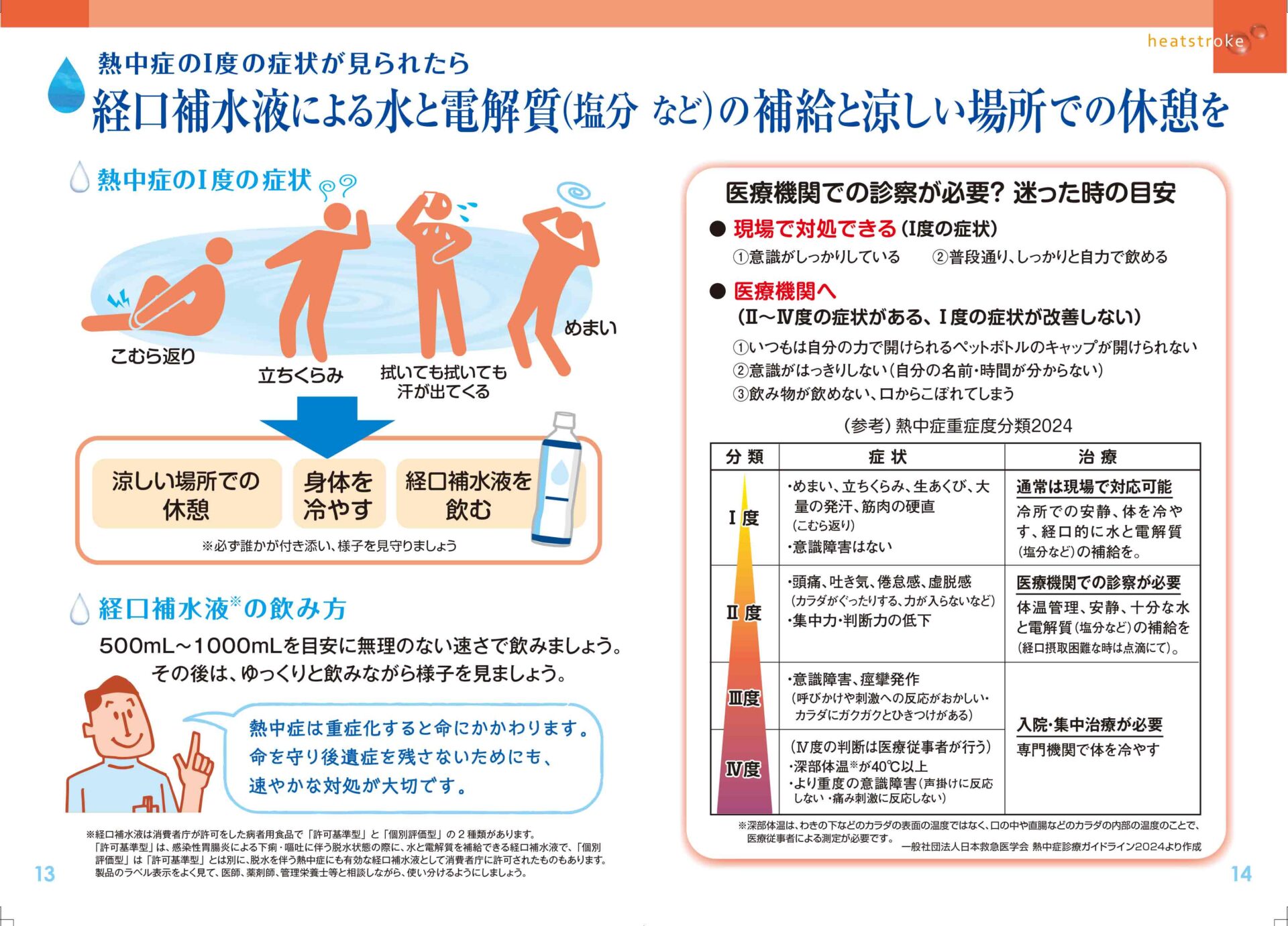 経口補水液による水と塩分の補給と涼しい場所での休憩を